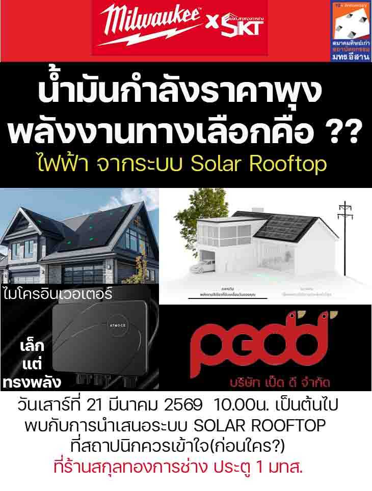 สมาคมศิษย์เก่าสถาปัตย์ มทร.อีสานจัดงาน วันเสาร์ที่ 21 มีนาคม 2569 นี้ เรียนเชิญผู้ที่สนใจร่วมฟังการแนะนำระบบ Solar Rooftop ได้ที่ร้านสกุลทองการช่าง ประตู 1 มทส. ตั้งแต่ เวลา 10 โมงเป็นต้นไป โดยงานนี้ร้านMilwakee สกุลทองการช่าง เตรียมพื้นที่รองรับ พี่ๆน้องๆ เพื่อใช้โอกาสนี้ฟังระบบและการติดตั้งไฟฟ้าพลังงานแสงอาทิตย์