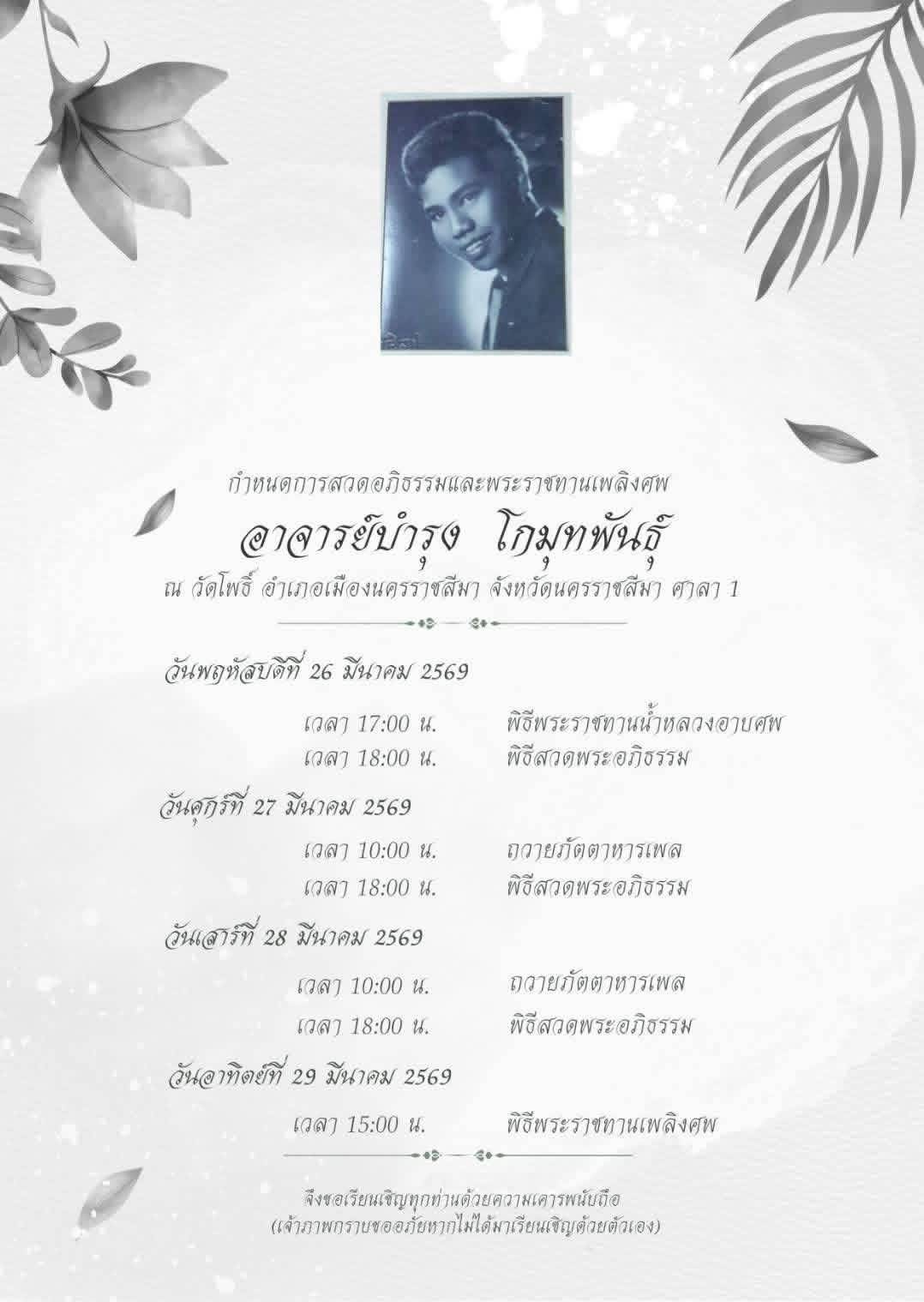 นายจะเด็ด โกมุทพันธุ์(พี่อ้อม) รุ่น 25 สมาชิกสมาคมเลขที่ 01250187 แจ้งข่าวกำหนดการคุณพ่อ อาจารย์บำรุง โกมุทพันธุ์ ณ วัดโพธิ์ อ.เมือง จ.นครราชสีมา ศาลา 1 ตั้งแต่วันที่ 26-28 มีนาคม 2569 และวันอาทิตย์ที่ 29 มีนาคม 2569 พิธีพระราชทานเพลิงศพ เวลา 15.00น.